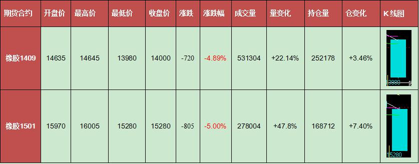 今日橡膠受日膠連日下跌影響,小幅低開后持續(xù)下跌,10點(diǎn)后放量下跌,午后盤面延續(xù)價(jià)格下跌恐慌情緒,1501合約最終以跌停板收盤,1409合約以接近跌停價(jià)格收盤,跌幅達(dá)4.89%。成交量與持倉(cāng)量總體均呈上升趨勢(shì),1501合約放量下跌趨勢(shì)尤其明顯。日膠指數(shù)跌破200,跌幅達(dá)3.97%。