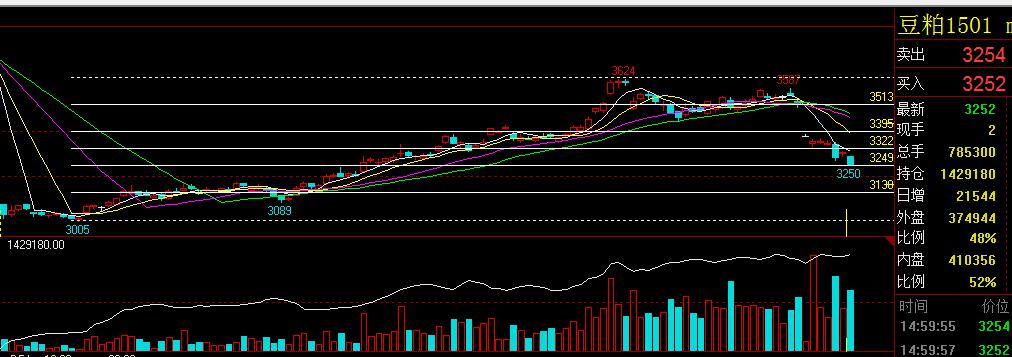 豆粕1501 | 3,291 | 3,291 | 3,250 | 3,252 | -48 | 785,300 | 22.8萬 | 1,429,180 | 21,544 |