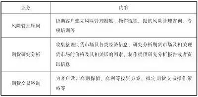期貨公司期貨投資咨詢業(yè)務(wù)是指基于客戶委托,期貨公司開展的風(fēng)險管理顧問、期貨研究分析、期貨交易咨詢等營利性業(yè)務(wù)。具體業(yè)務(wù)內(nèi)容為如下: